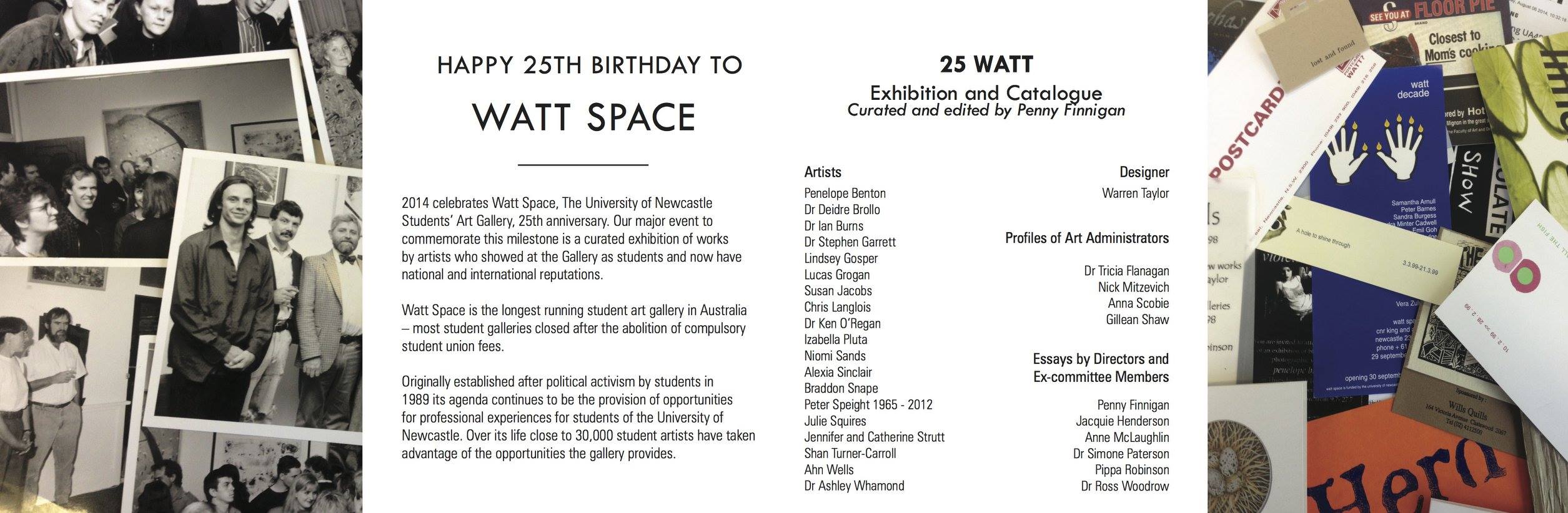 25 Watt 11 September – 28 September 2014 Group Exhibition: 25 Watt: 25th Anniversary Watt Space Gallery Where: Watt Space Gallery, King St, Newcastle 2300 Gallery Hours: Wednesday – Sunday 11am – 5pm Opening night: Thursday 12 September, 6.30pm