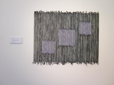 Ahn Wells’ recently exhibited work in the group exhibition POINT OF ENTRY at the Front Room Gallery,Newcastle is titled 3 Dusty Purple Woolie Squares (2011). It is a frameless rectangle of 60cm x 80cm, comprised of regularly spaced vertical strands of black, crocheted woollen yarn into which have been knotted three fifteen centimetre, dusty purple squares, rising diagonally from the lower left.