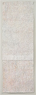 Ahn Wells works on paper using a vocabulary of minimalism and abstraction combined with the use of textiles and fibre, stitching together references to the ‘high art’ of mid-20th century Modernism with memories of the domestic labour and craft of women. She told me that she generally works in a square format evoking the Modernist grid, but decided to make scroll-shaped works for this exhibition. ‘Inscription’ I and II are subtle and quiet. On close inspection they reveal richly layered pale gouache, oil pastel, ink, stitching, and finally a scribbled layer of pencil marks on paper punctured with tiny holes, prompting all sorts of memories and associations, from Pianola rolls to computer coding to the scribbles of children. Encryption, encoding and written script in all its forms are evoked in a manner that subtly suggests the sheer difficulty of communication and the ease of misinterpretation.
